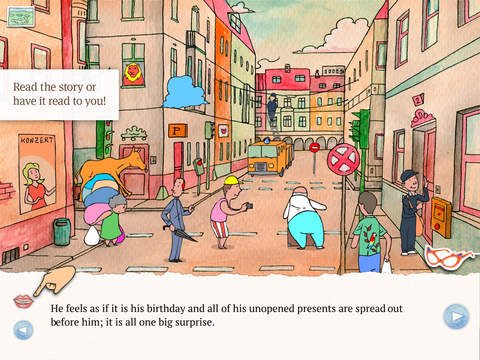Kids can choose to read by themselves or listen to the app narration, in English or German. They can also skip to any page on Max’s journey home from the park on the city map.