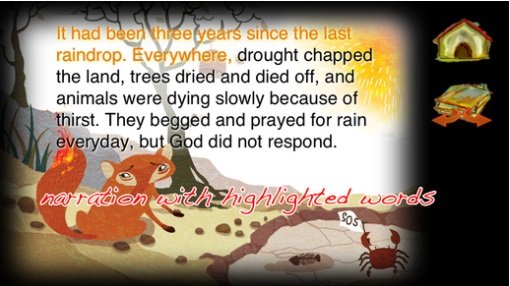 Toad Sues God by iKidsReads is a universal picture book app for iOS featuring a folktale from Vietnam about a frog who grinds their teeth and rain. The story features four animals: frog, fox, bear and tiger. After successfully capturing each of the four animals that God has released via the gates, Toad is given an audience with him. Toad shares the story about how there is no rain in his area and God discovers that the rain manager has been playing rather than giving rain to the animals via the dragons. God tells Toad if it does not rain, he must just grind his teeth and he will make it rain and does not need to return. The book features two modes, read to me and read to myself. With the read to me option, as the words are read they are highlighted which is good for emerging readers. Navigation within the app is simple with a swipe, and there are four icons at the bottom of each page: a house which returns you to the main screen, a book with arrows which allows you to pick a page, a child face which means you can toggle between the “read to me” and “read to myself” mode, a video camera which shows a movie with the interaction to the page, and a box that allows you to make the words appear and disappear in the read to myself mode.